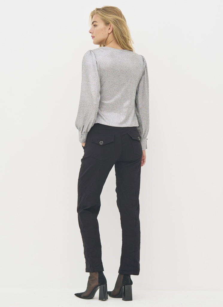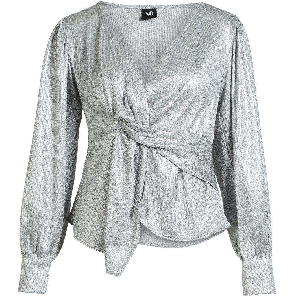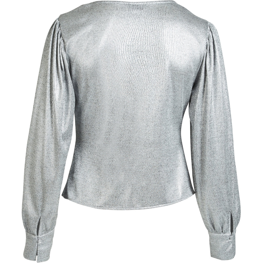 Stand out with this eye-catching wrap blouse with a subtle metallic sheen. It features a flattering V-neckline and an elegant tie belt at the waist, highlighting the figure. The long sleeves are finished with cuffs for a classic look, while the fabric's shiny texture adds a modern twist.