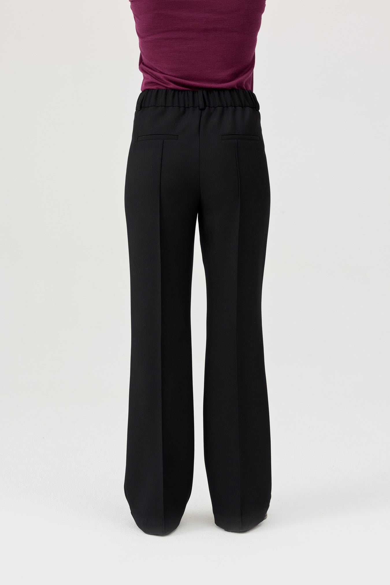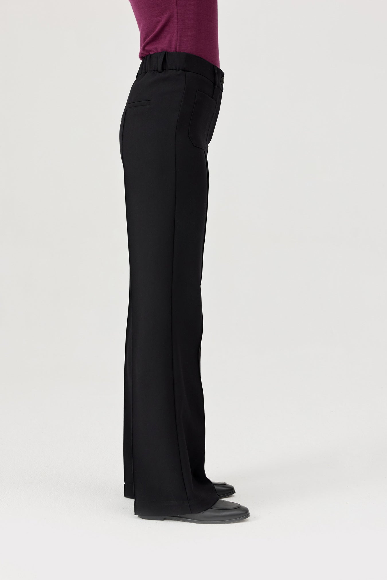 FÉRIA straight-leg trousers in deep black. Elegant, classic-cut trousers with a straight leg and high waist. Made of smooth, slightly stretchy fabric that drapes beautifully and provides comfort. Front patch pockets add a fashionable touch, while the crease visually elongates the legs. Perfect for the office, meetings, or as a base for a smart-casual look.