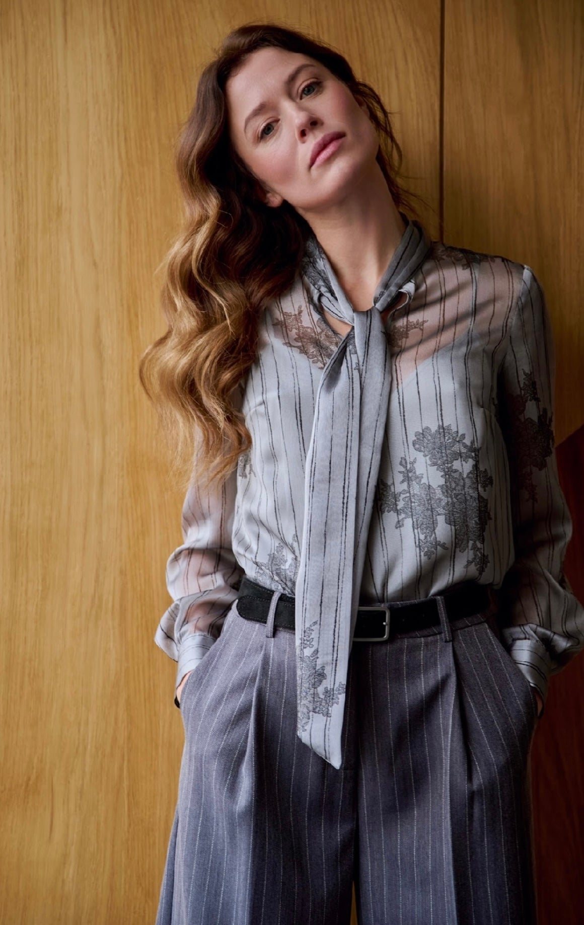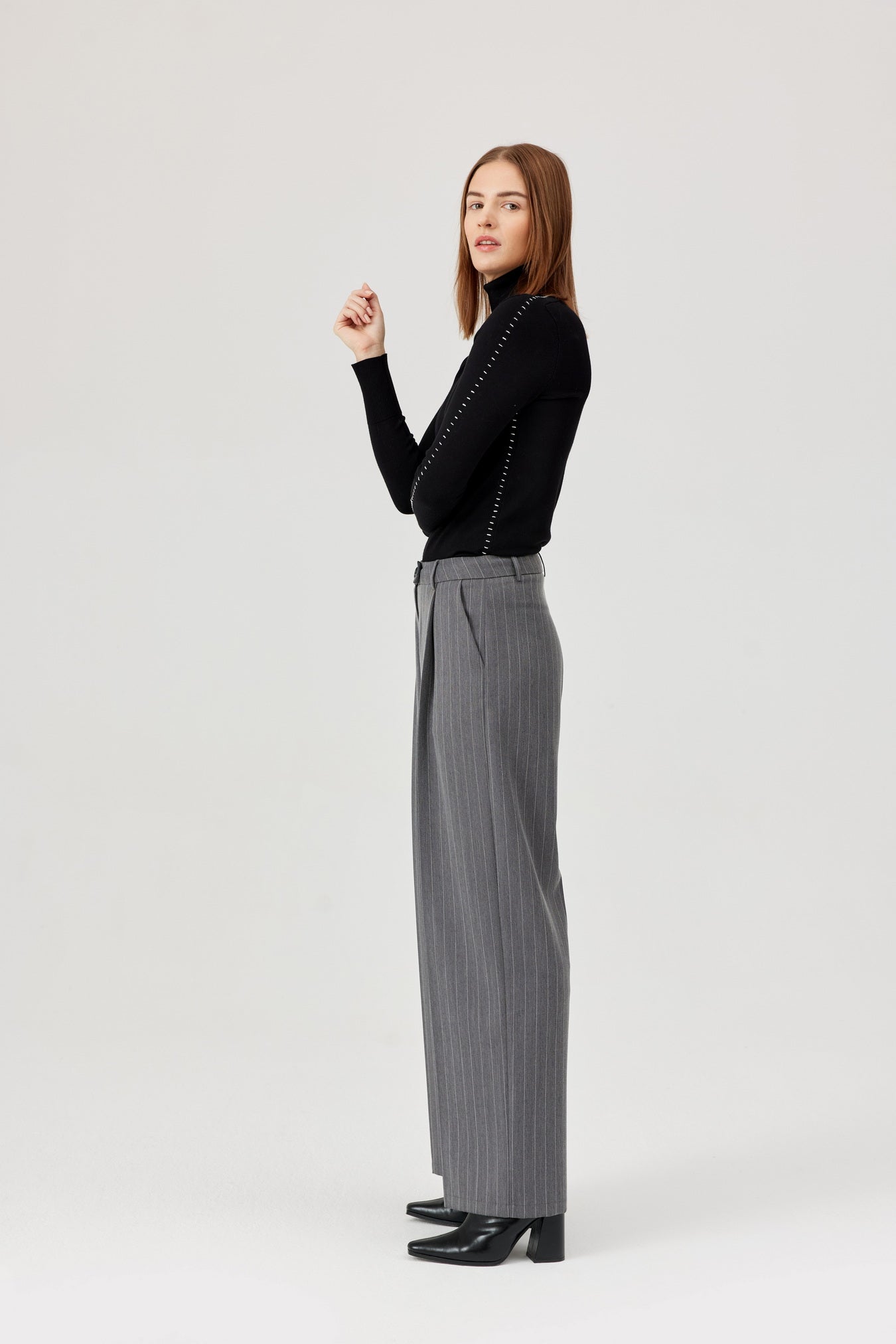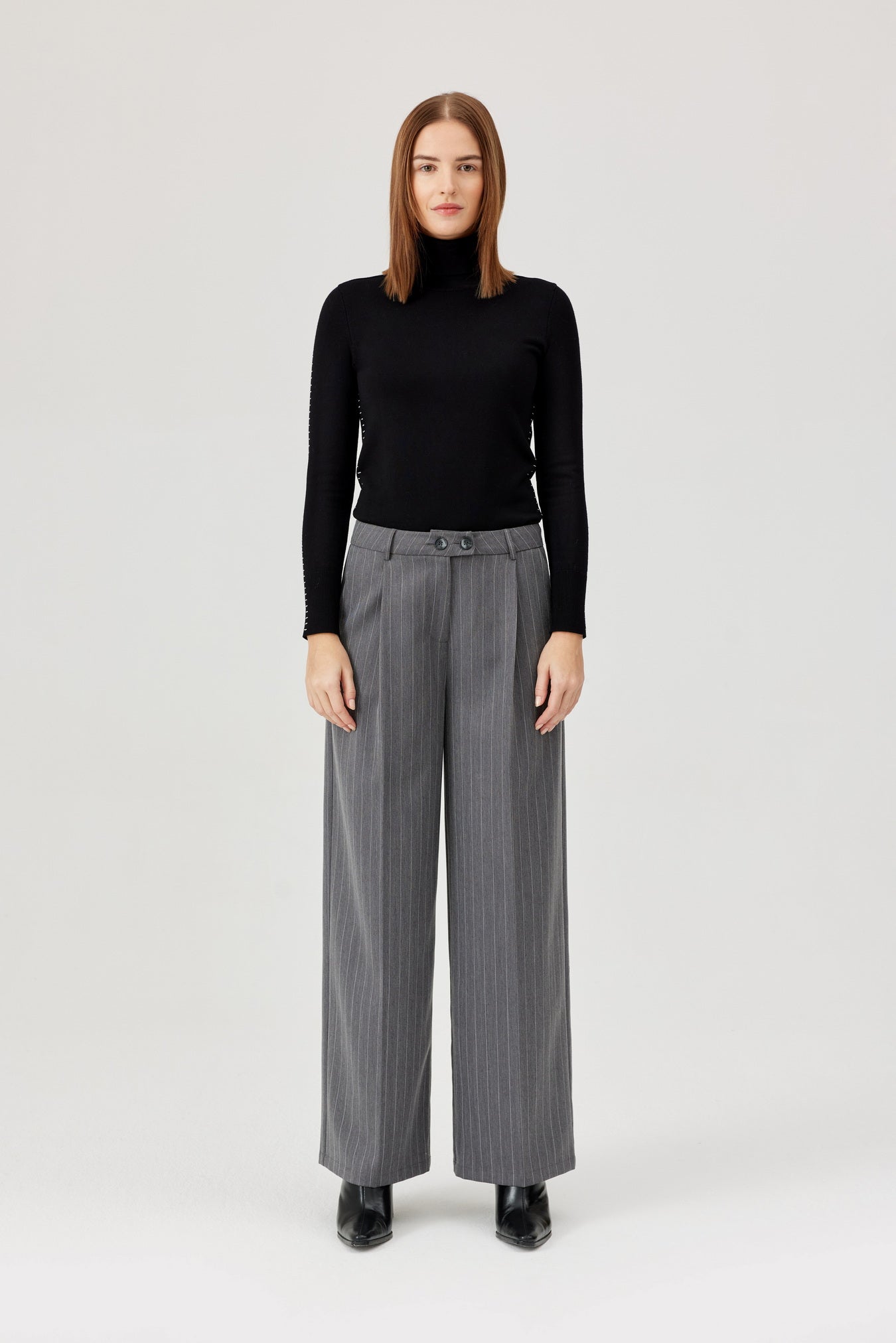 FÉRIA pinstripe trousers – elegance in a business style. Grey trousers with a wide leg, crafted from smooth fabric with subtle vertical stripes. They feature a high waist, a crease-pressed waistband, and a double button and zip fastening. Perfect for the office and formal meetings – they look great paired with the matching blazer or an elegant blouse for a more stylish look.