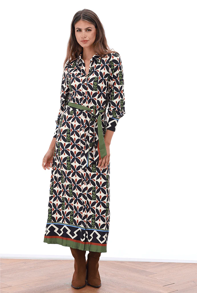 • The dress is a shirt style and has the classic button-down front and collared neckline. The black base print is edged in a contrasting border hemline in a green and red. The look is finished with a contrasting detachable belt to cinch the waist for a very flattering silhouette.