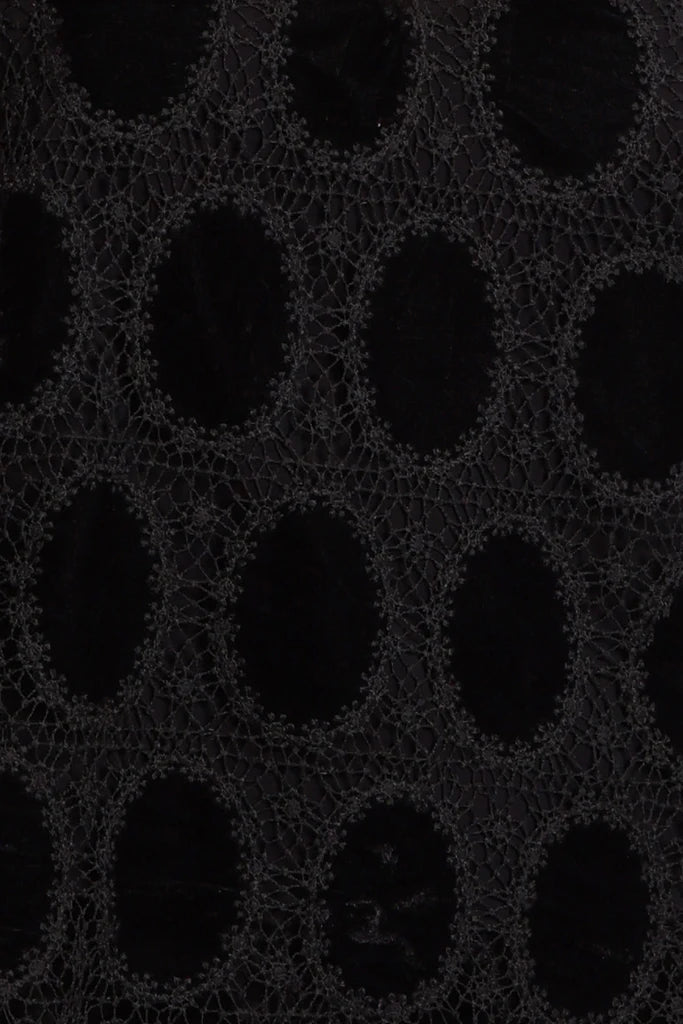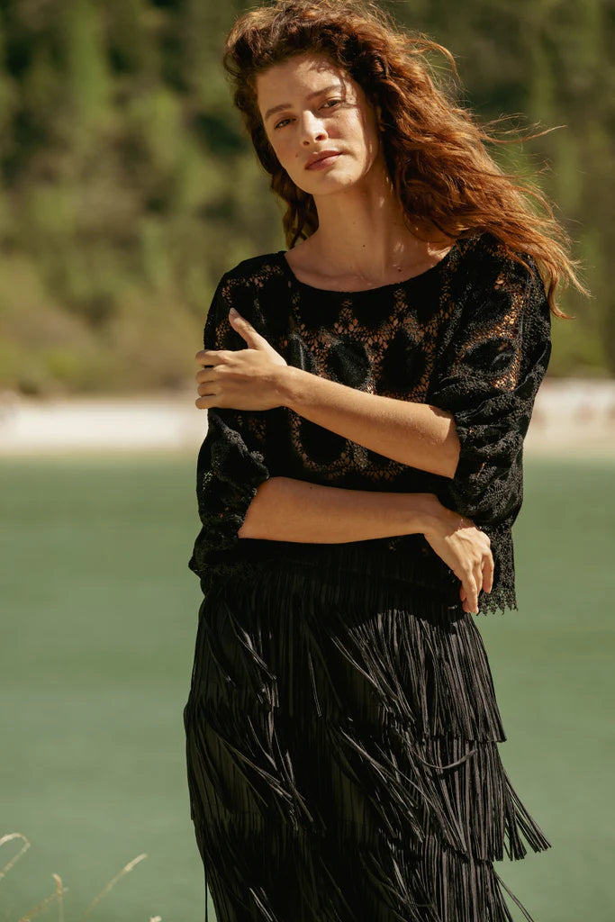 The Bloom is the perfect loose fit top for the Autumn/Winter season, with 3/4 length billow sleeves, dropped armholes and a flattering scoop neckline. It looks stunning in the black crochet style spot fabric of our The Great Silence collection. The perfect top for layering. Unlined. First model is wearing with our Nobody Asked Gloria Skirt. Pair with our matching The Great Silence Evie Trousers.