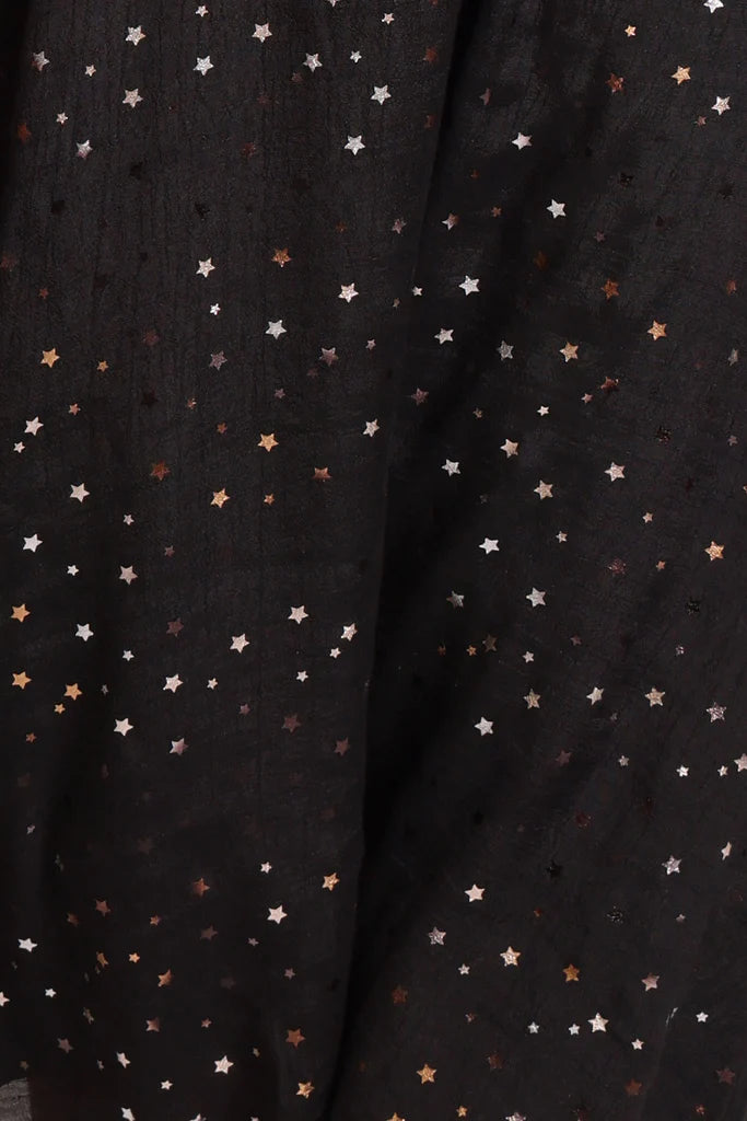 The Charlie Blouse is a beautifully simple V-neck shape, featuring a classic shirt collar and 3/4 length bracelet sleeves which are finished in an elasticated cuff. Made all the more beautiful in this black fabric adorned with a metallic star print. The perfect festive top that can easily be dressed up or down to suit all occasions.