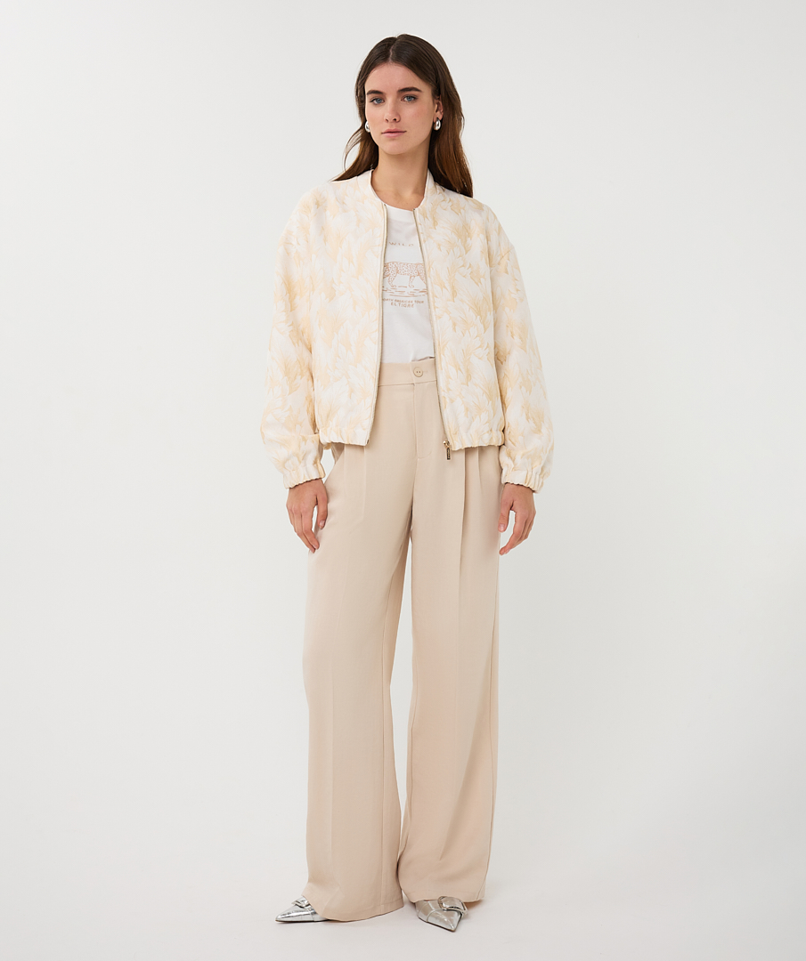 • Beautiful bomber jacket in our Jacquard Feather print. The jacket has a gold zipper and an elastic waistband.