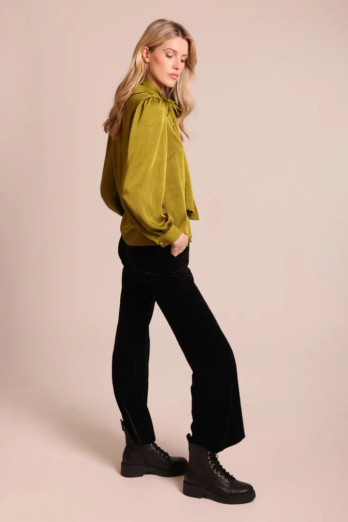 In a stunningly soft olive green fabric, our Revenge Shirt is sure to be your go-to blouse for the season. A classic V-neck shirt, but with a removable bow which can be tied whichever way you like. The long balloon sleeves are finished with a buttoned cuff to give the most flattering silhouette. A perfectly versatile shirt which can be dressed up for down to suit all occasions.