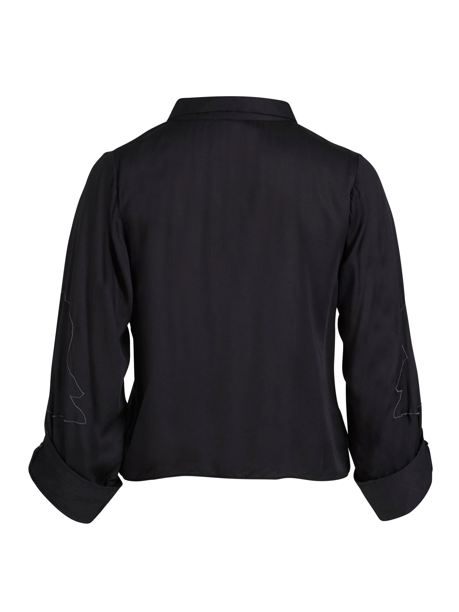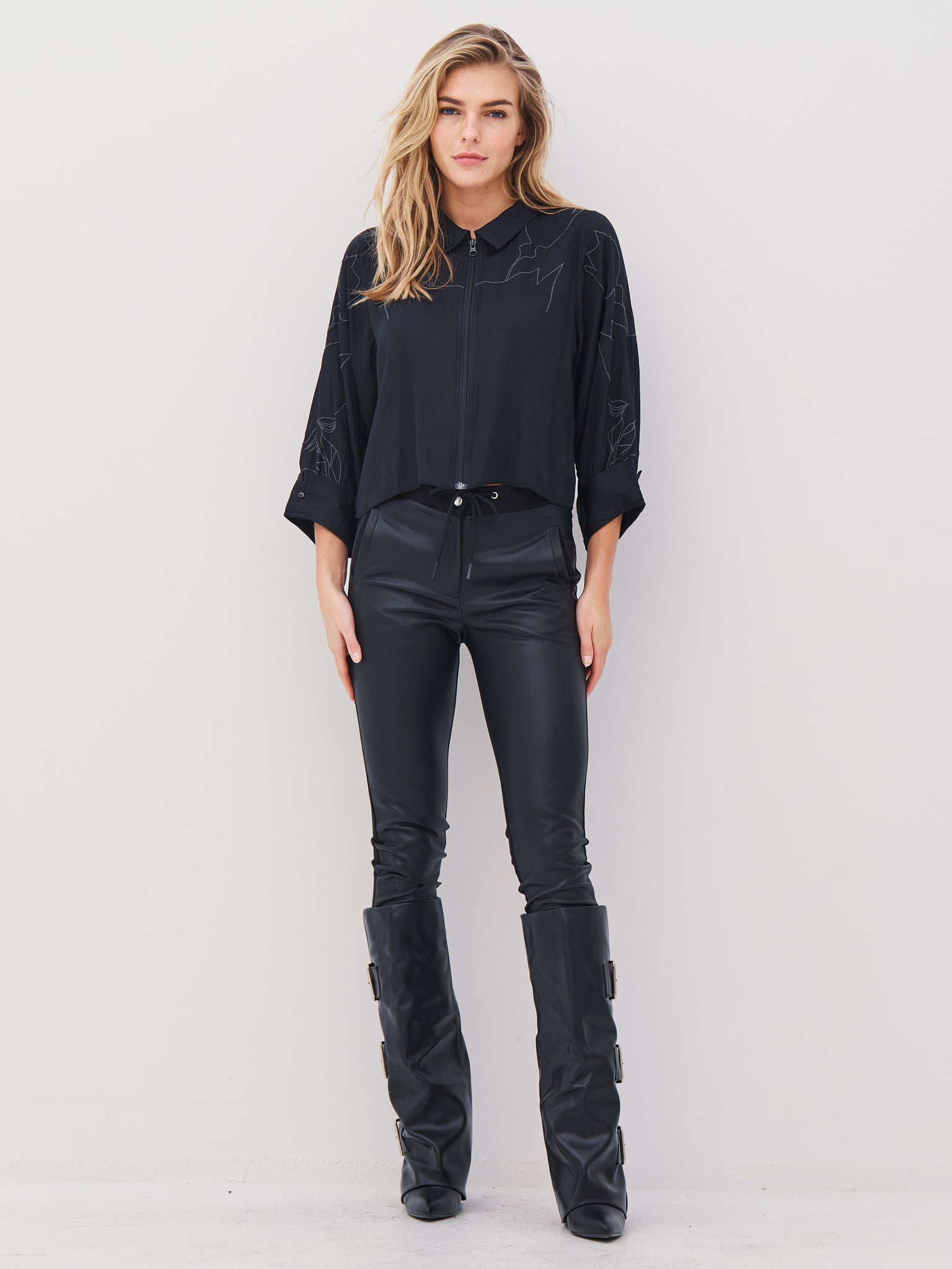 This lightweight jacket combines a minimalist cut with delicate, embroidered details. It features a full-length front zipper, classic shirt collar, and long sleeves with cuffs rolled up, creating a relaxed expression. The simple design is complemented by decorative stitching, adding an artistic touch to the jacket.