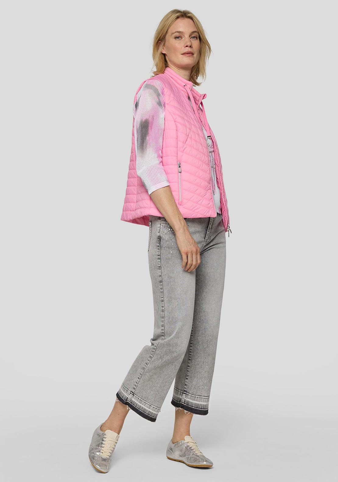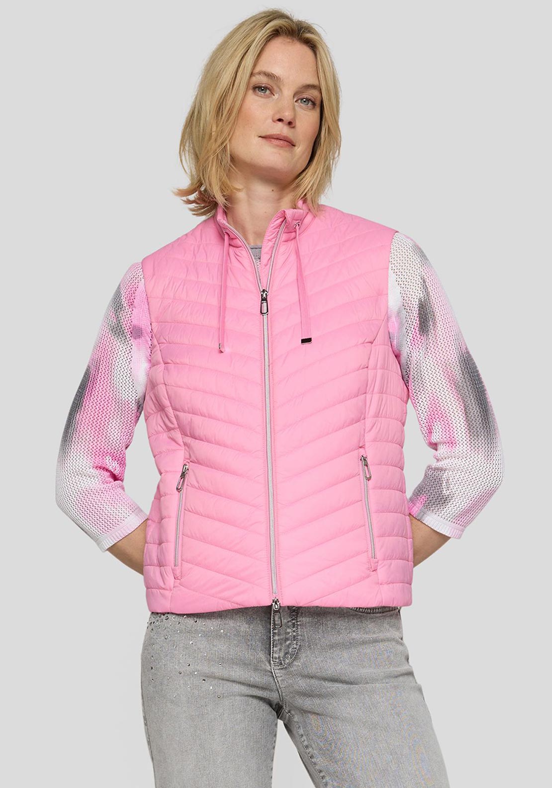 Say hello to this seasons pink from RABE. This Gilet has a quilted texture for a lightweight warmth feel, and a sleeveless layer is perfect for spring summer.