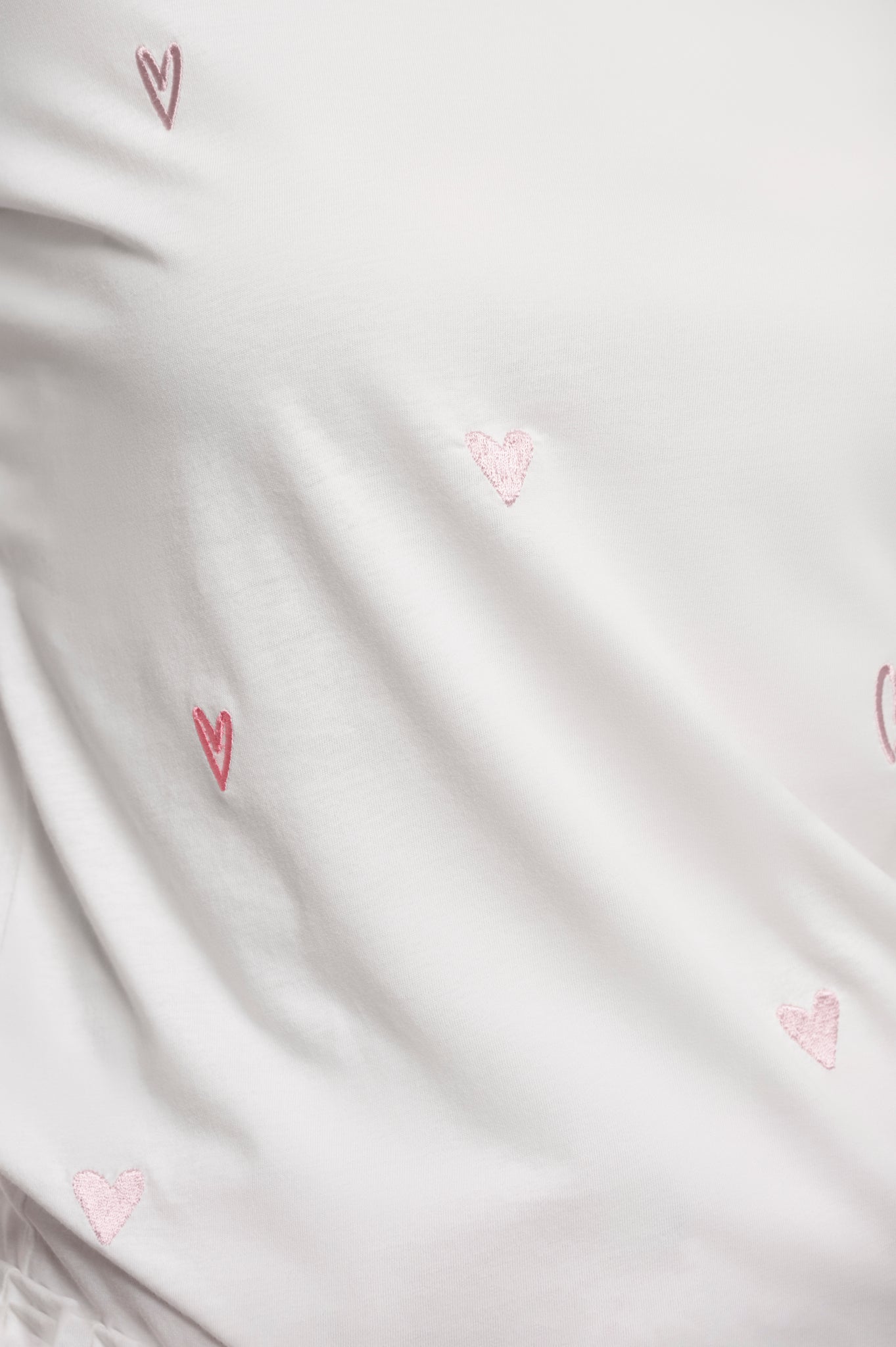 Indulge in effortless elegance with this soft T-shirt, adorned with delicate all-over heartshaped embroidery that adds subtle texture to its clean silhouette. Crafted from a smooth, breathable fabric, it offers everyday comfort with a refined finish.