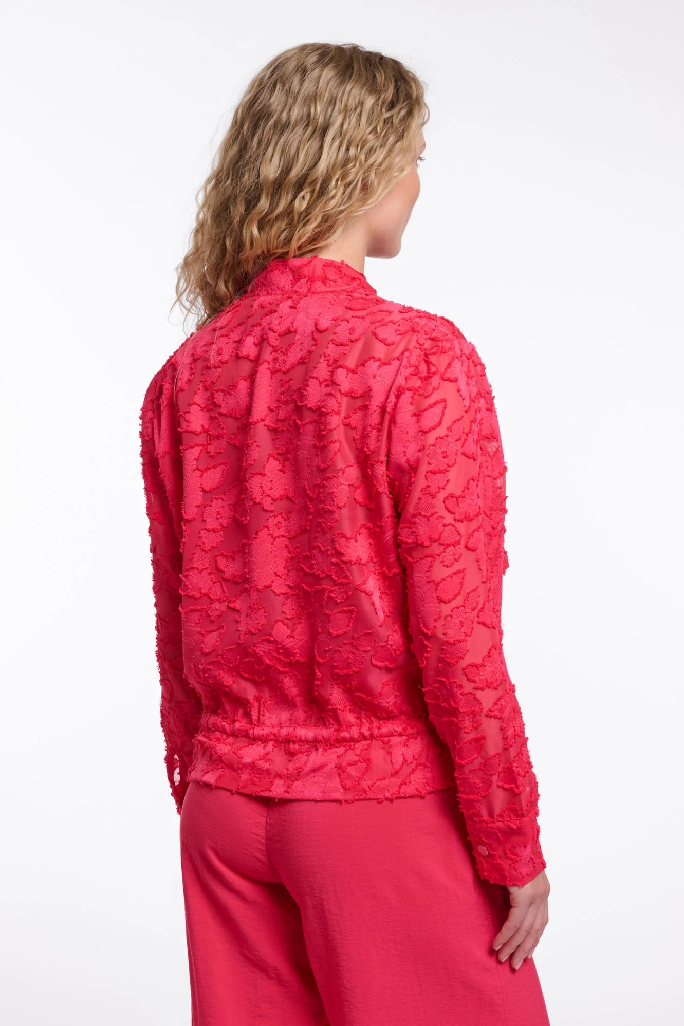 Elevate your look with this lightweight printed jacket, featuring a subtle floral pattern and a slightly sheer finish for an elegant, airy touch. Designed with a sleek zipper closure and two patch pockets with buttoned flaps, it blends modern utility with feminine ease. The adjustable drawstring hem allows you to shape the fit, making it a versatile piece for refined, Contemporary styling.