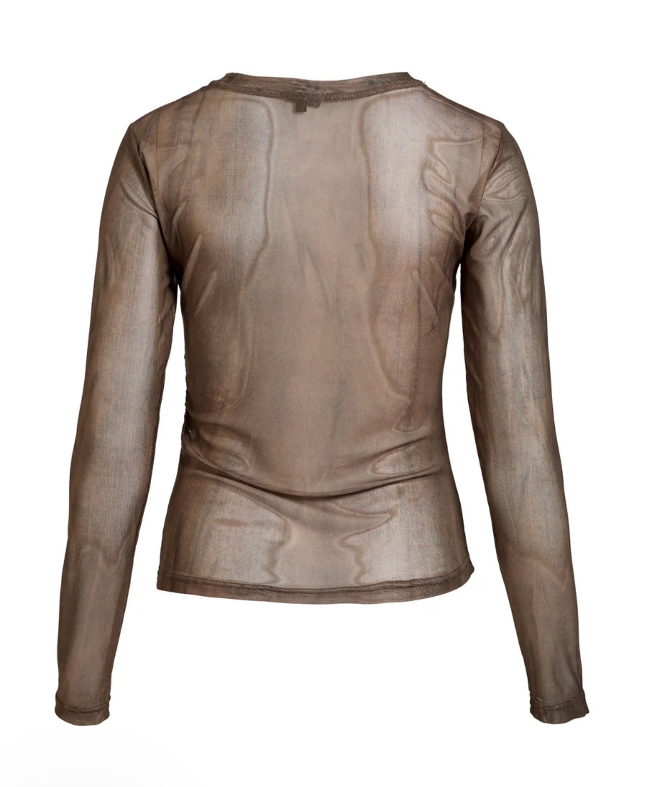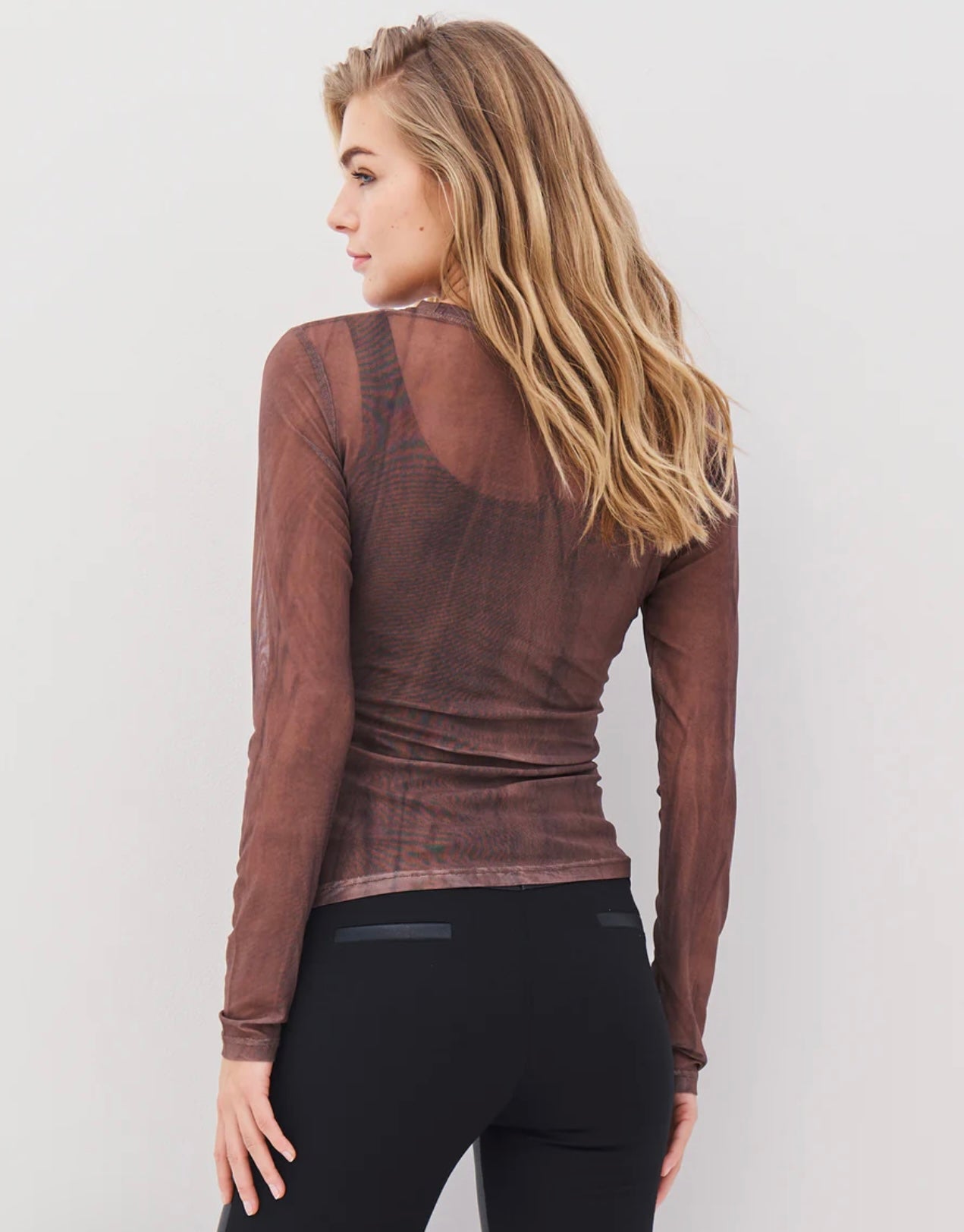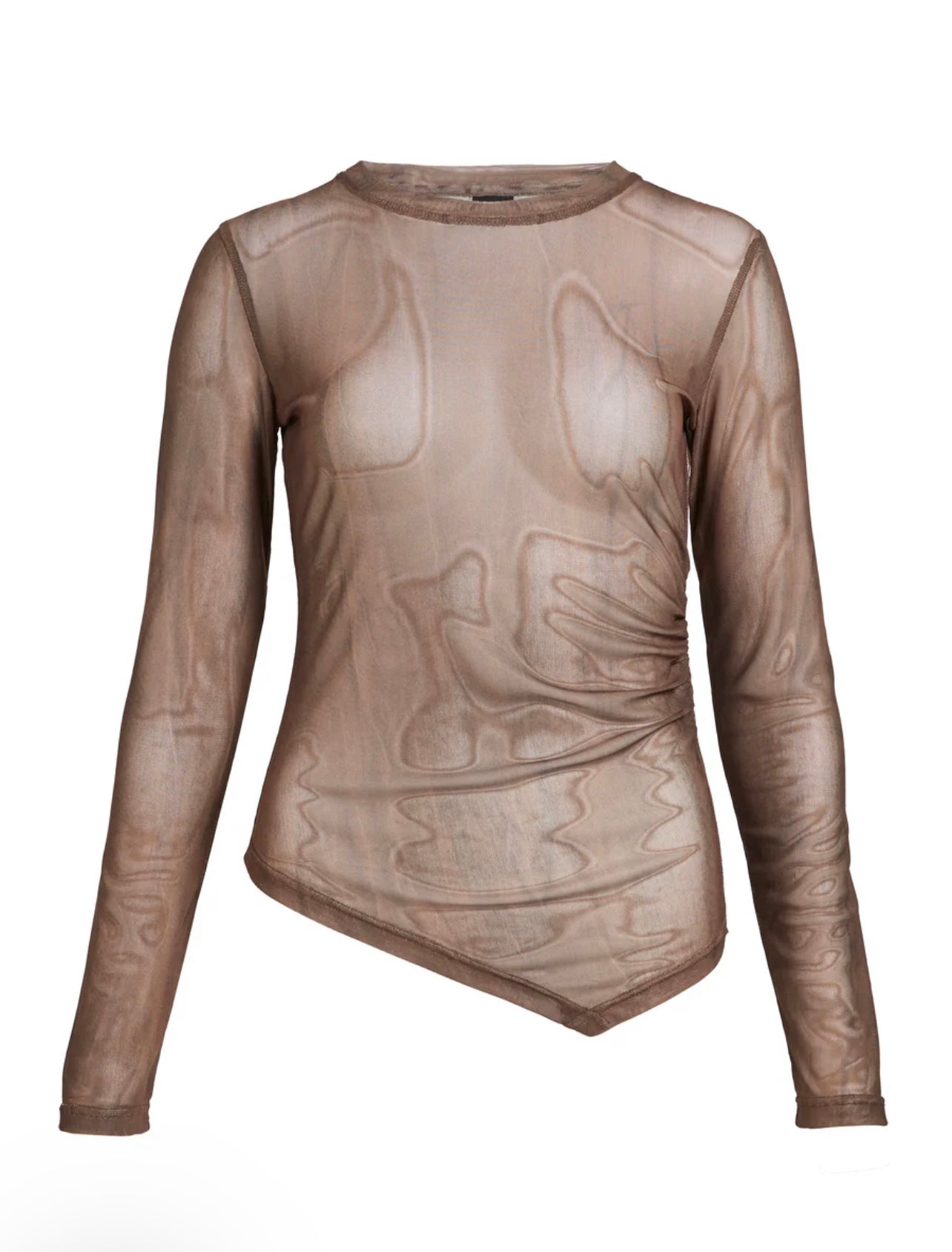 This mesh blouse has a slightly transparent expression and an asymmetric finish at the bottom, creating an exciting and modern silhouette. The material drapes lightly around the body, while the long sleeves and round neckline provide a simple and elegant look.